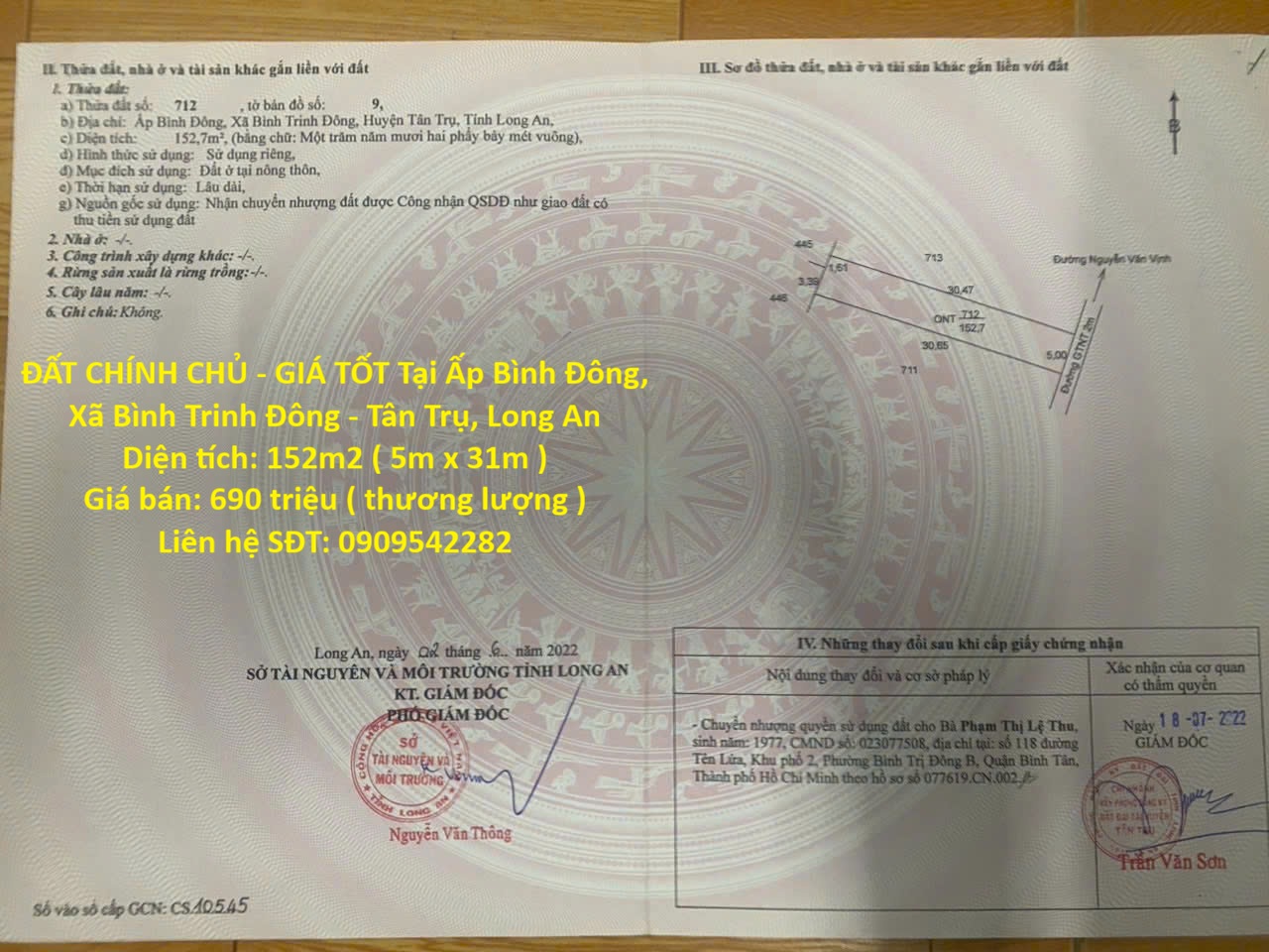 ĐẤT CHÍNH CHỦ - GIÁ TỐT Tại Ấp Bình Đông, Xã Bình Trinh Đông - Tân Trụ, Long An