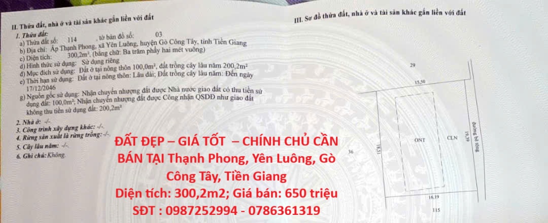 ĐẤT ĐẸP – GIÁ TỐT – CHÍNH CHỦ CẦN BÁN TẠI Thạnh Phong, Yên Luông, Gò Công Tây, Tiền Giang