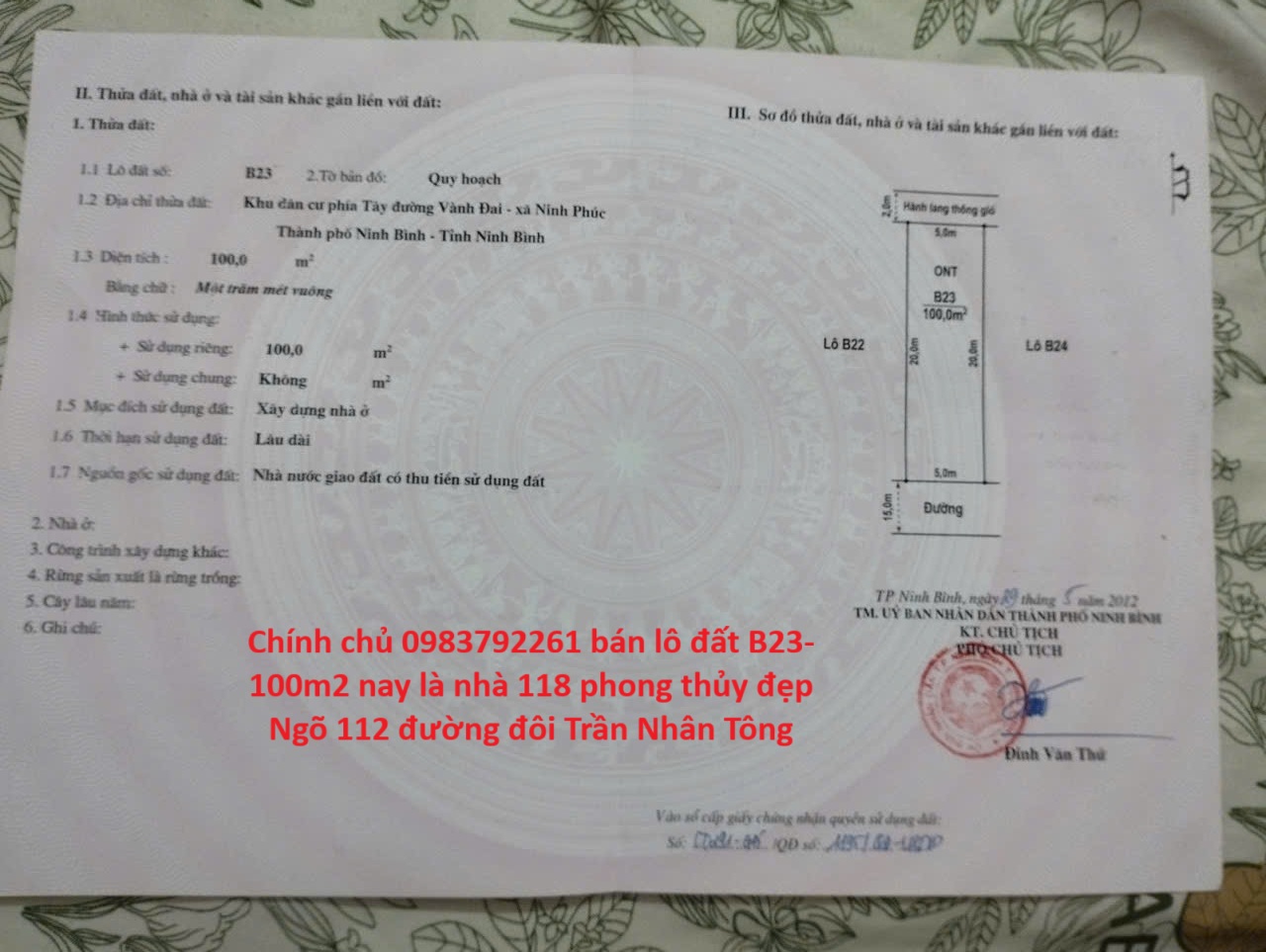 Chính chủ sđt 0983792261 Cần bán lô đất B23 diện tích (5×20=100m2) Hướng Nam Nay là nhà số 118 Số nhà phong thủy đẹp nhất khu vực nhất phát Hưng Thịnh cát tường ... Giá khởi điểm 4ty ××× còn thương lượng sâu.. ... Muốn có ngôi nhà phong thủy tốt cho vài đời con cháu An khang thịnh vượng hãy xuống tiền mua nhà để ở số nhà phong thủy đẹp nhất. Ngõ 112 đường đôi Trần Nhân Tông sát cạnh khách sạn Yến Ngọc và thiên hà đối diện Gobichsi Ninh Bình và công ty Hon đa và moto mi subisi và các công ty tập đoàn lớn công nghệ xanh thông minh đang hoạt động. Một lô B23 Duy nhất mở bán nằm kề các tiện ích khác chỉ vài phút.