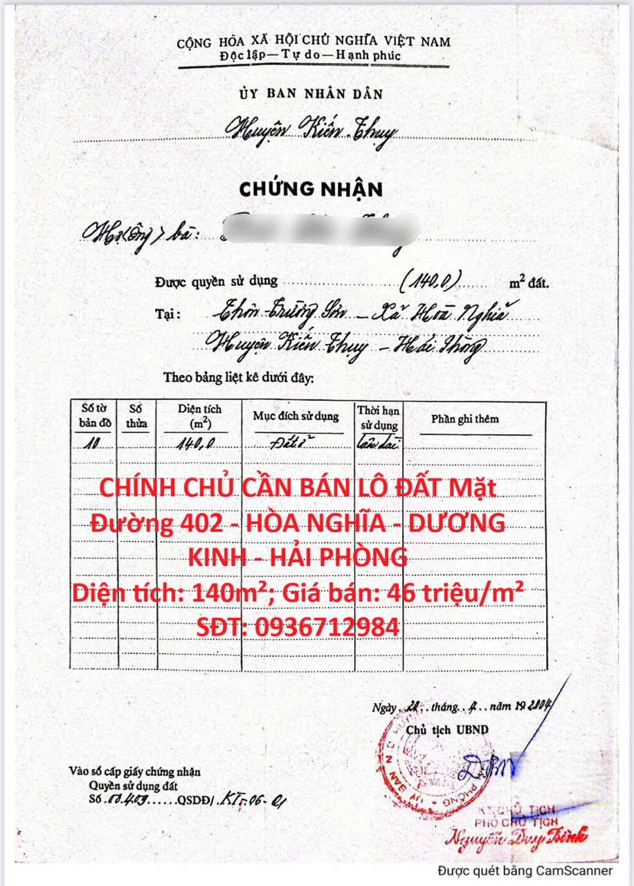 CHÍNH CHỦ CẦN BÁN LÔ ĐẤT Mặt Đường 402 - HÒA NGHĨA - DƯƠNG KINH - HẢI PHÒNG