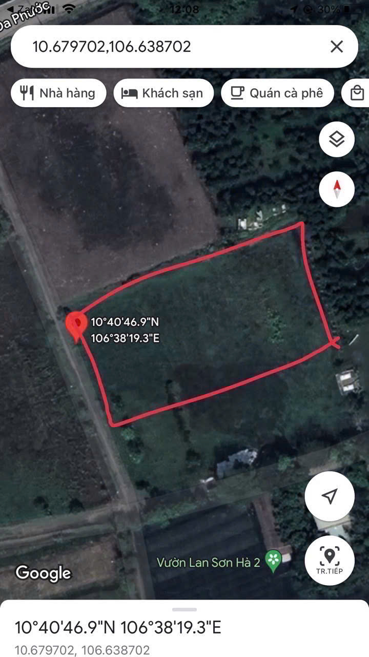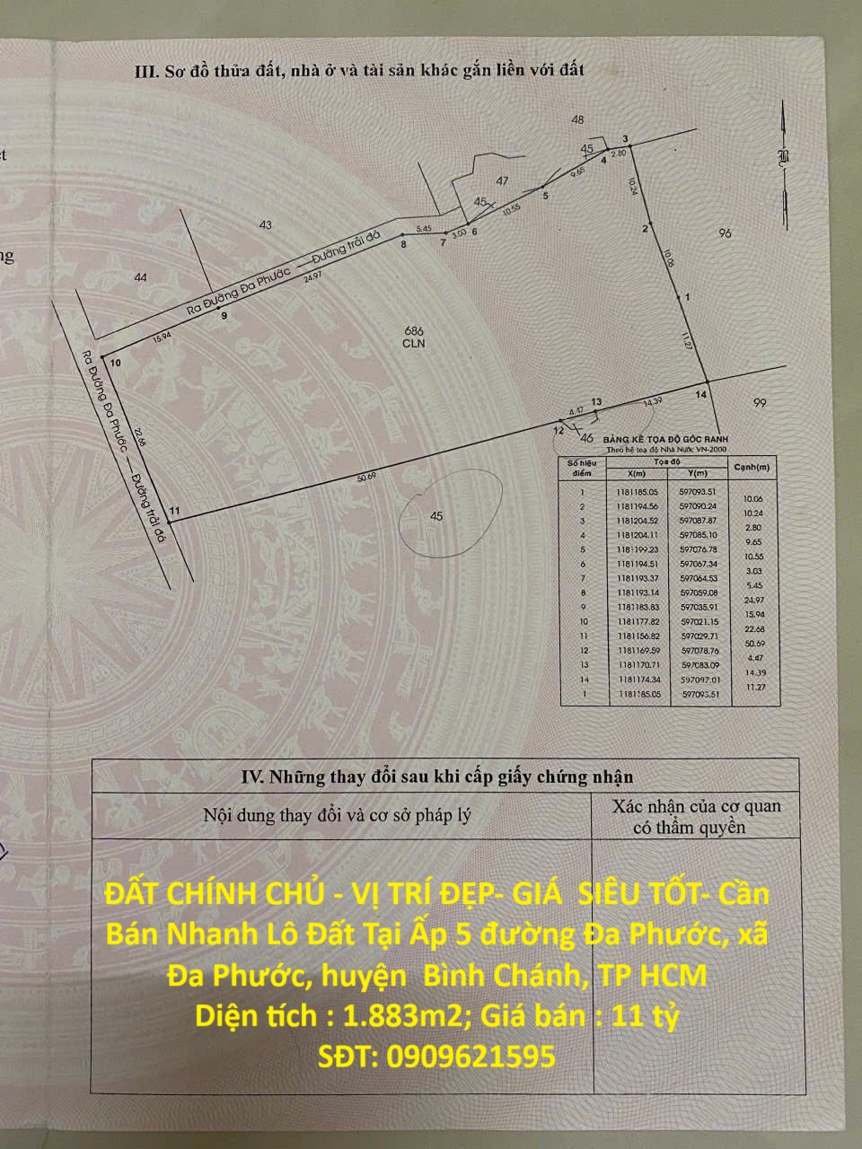 Diện tích : 1.883m2, đất trồng cây lâu năm ( ngang 23m2, dài 65m2, nở hậu 32m2)