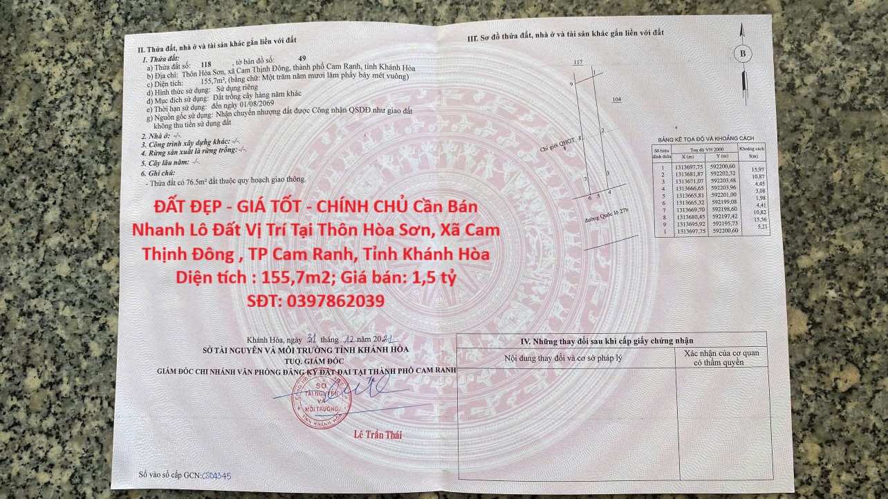 ĐẤT ĐẸP - GIÁ TỐT - CHÍNH CHỦ Cần Bán Nhanh Lô Đất Vị Trí Tại TP Cam Ranh, Tỉnh Khánh Hòa
