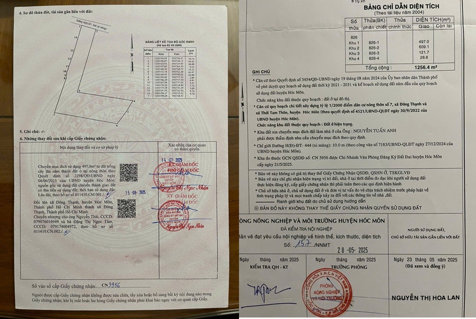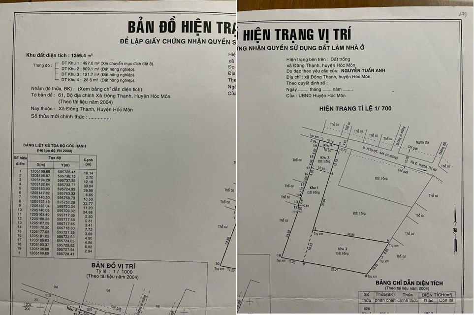Diện tích : 1256,4m2, trong đó : 497,0m2 thổ cư (10,14m*60m), nở hậu 45,08m
