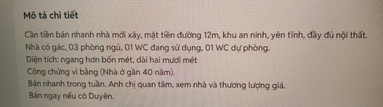 - Nhà 1 tầng có gác, 03 phòng ngủ, 01 WC đang sử dụng, 01 WC dự phòng, mặt tiền đường 12m, đầy đủ nội thất.
